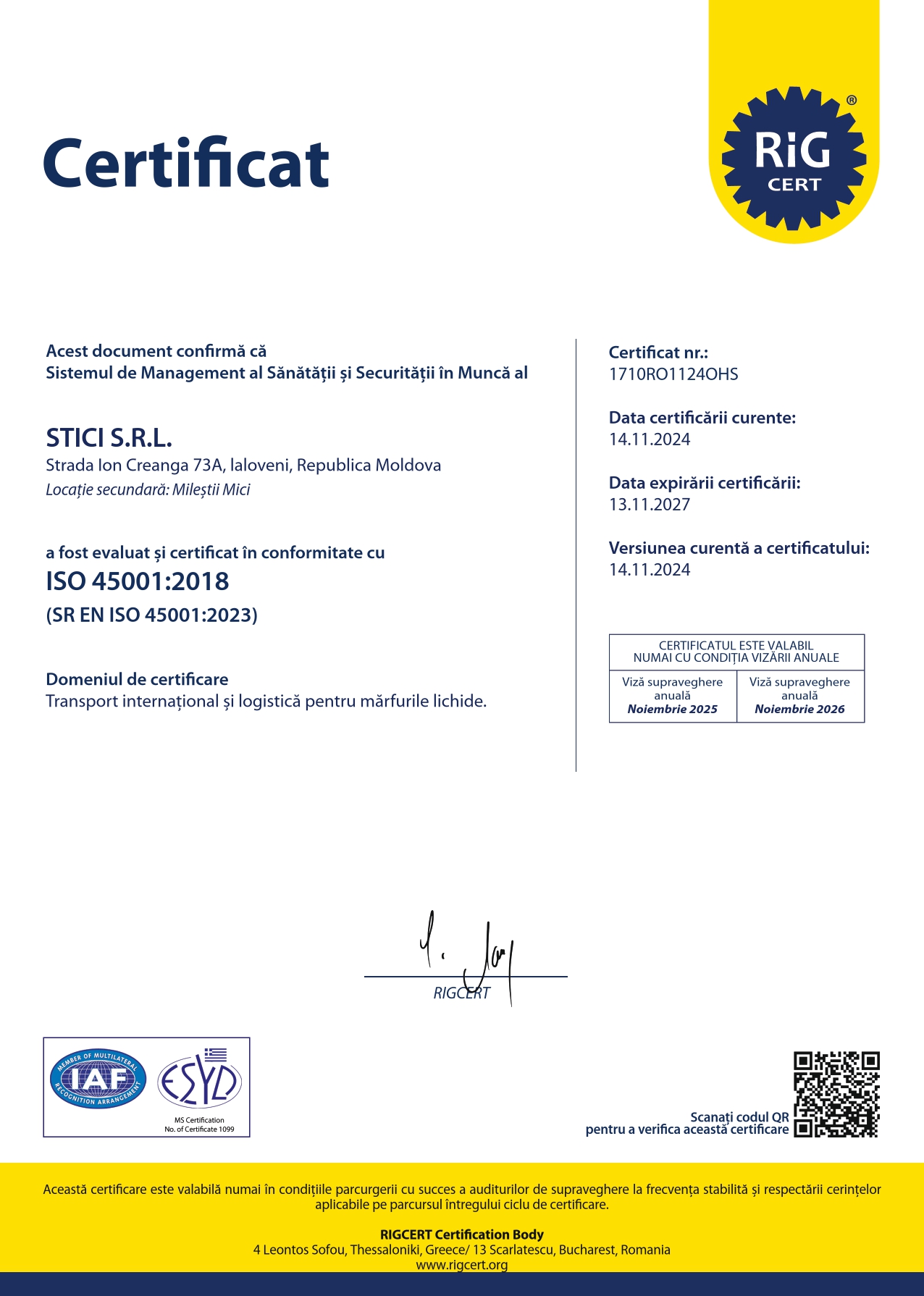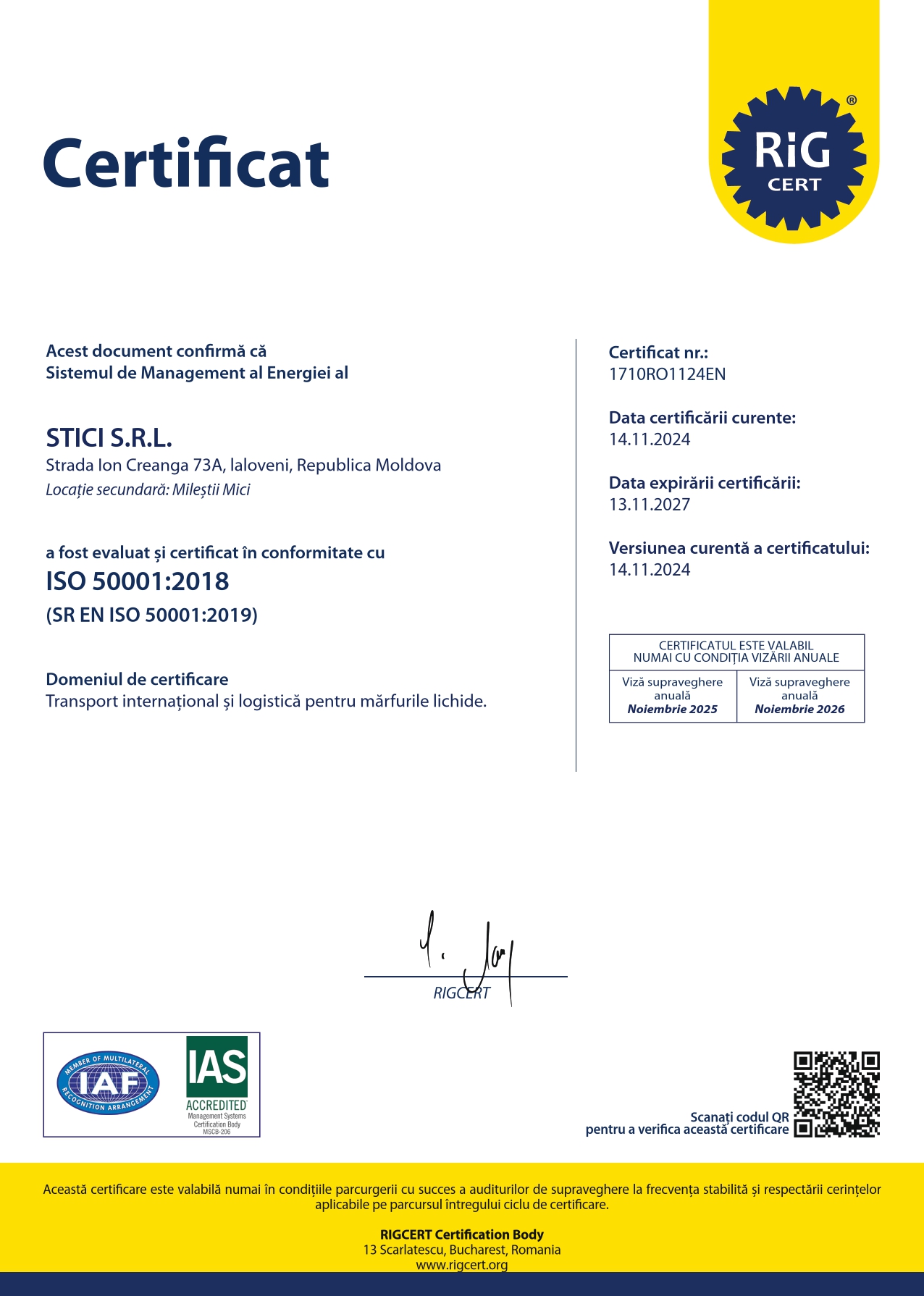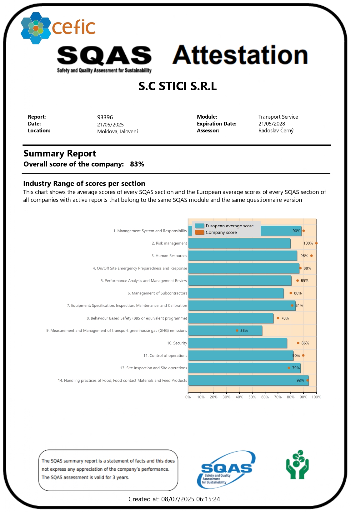 În plus, compania este atestată SQAS (Safety & Quality Assessment for Sustainability) cu un rezultat de 83%, reflectând angajamentul nostru față de siguranță, calitate și sustenabilitate în transportul de produse chimice și alimentare.