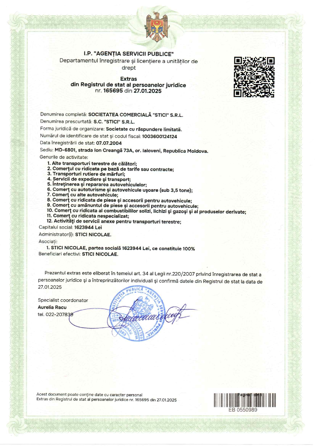 De la înființarea sa în anul 2000, SC STICI SRL a devenit rapid un operator respectat pe piața transporturilor rutiere cu cisterne, atât în Republica Moldova, cât și în întreaga Europă. Suntem recunoscuți pentru rapiditatea, siguranța și fiabilitatea serviciilor noastre, susținute de o echipă de angajați specializați.