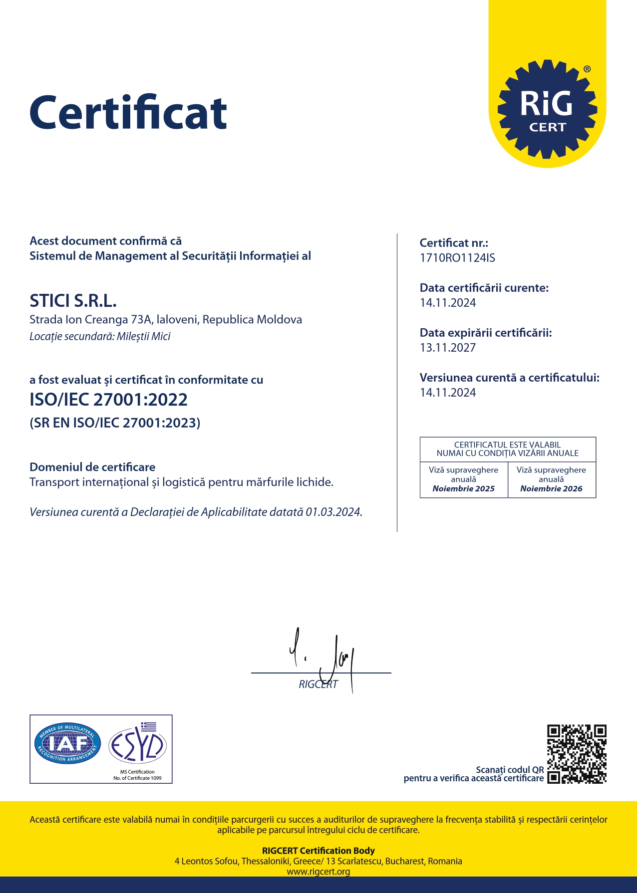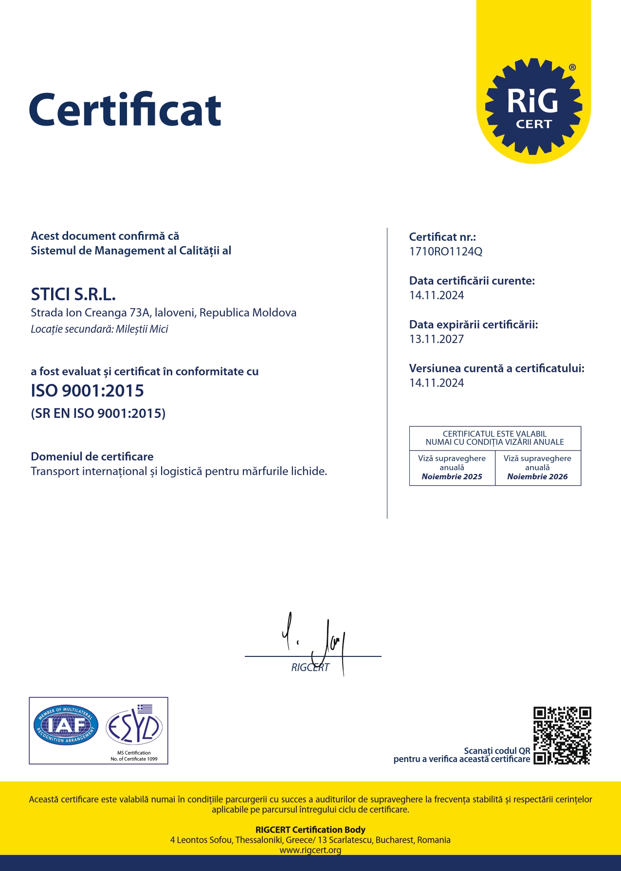 Compania este certificată conform celor mai înalte standarde internaționale de calitate și management, deținând următoarele certificări ISO: